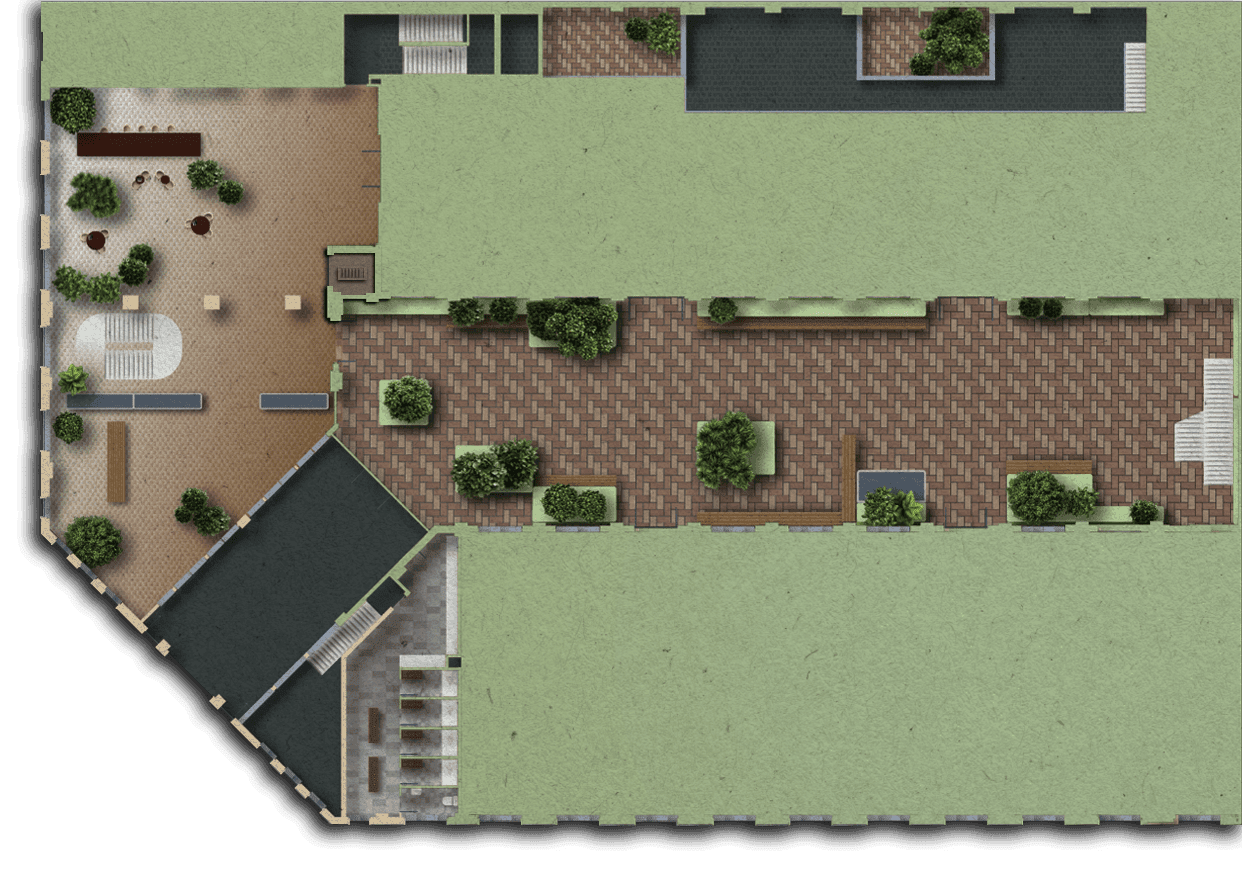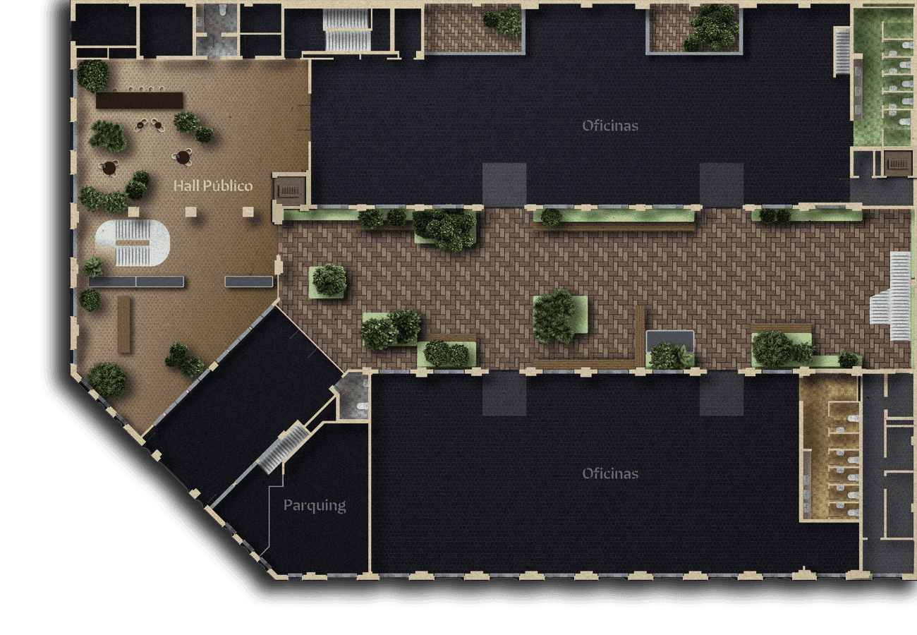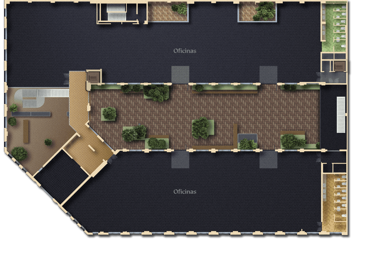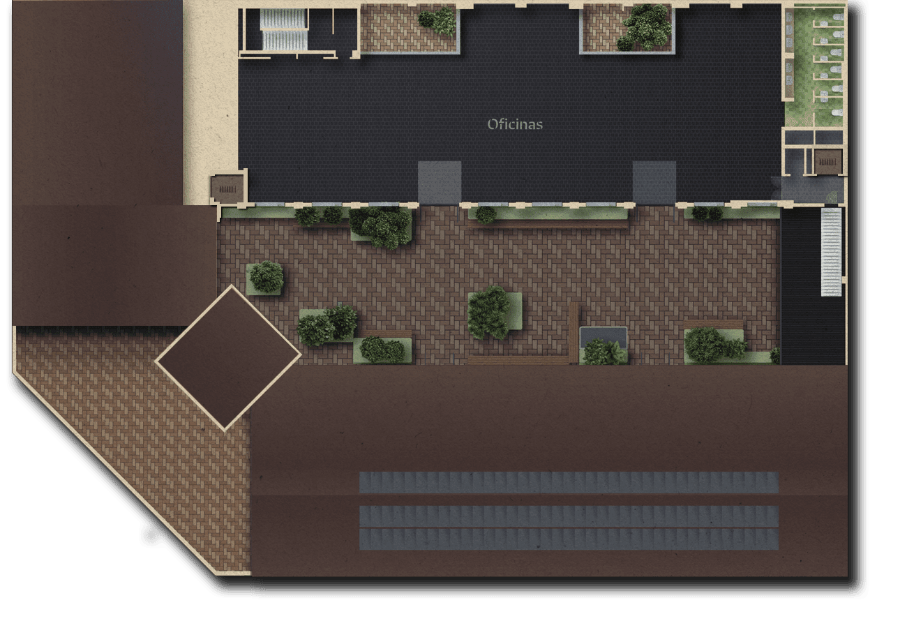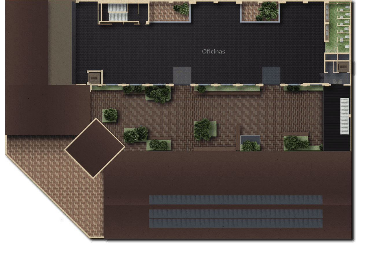 ASÍ QUE LLÁMALO COMO QUIERAS, PERO NO LO LLAMES OFICINA. ESPACIOS ABIERTOS, AÉREAS COMUNES INTERIORES Y EXTERIORES, Y UN PATIO CENTRAL VIBRANTE.